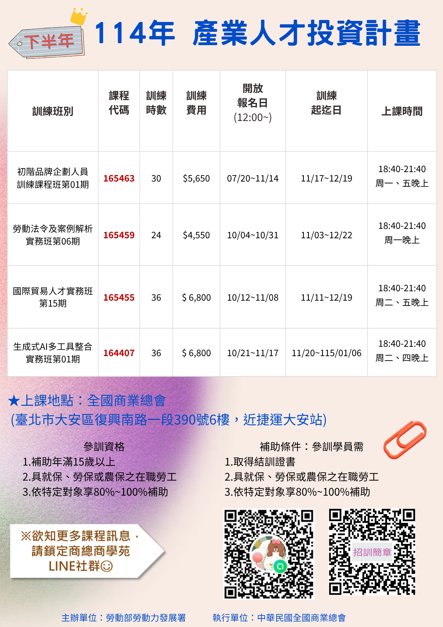 報名流程說明 :✅1.請先至台灣就業通:https://reurl.cc/0DxEdY 加入會員✅2.再至 在職訓練網:https://ojt.wda.gov.tw <課程查詢報名/產業人才投資方案>報名