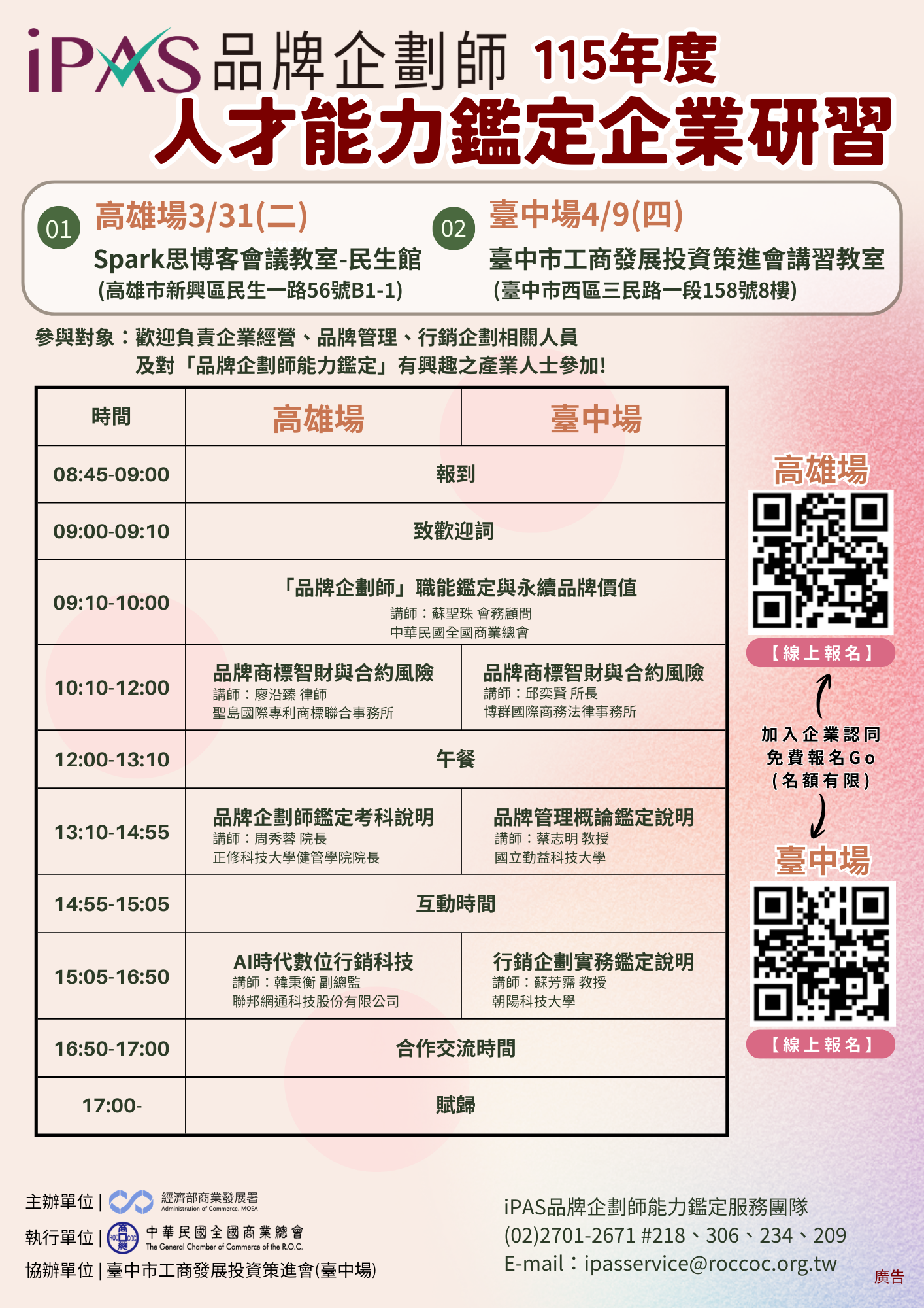參與對象:歡迎負責企業經營、品牌管理、行銷企劃相關人員及對「品牌企劃師能力鑑定」有興趣之產業人士參加