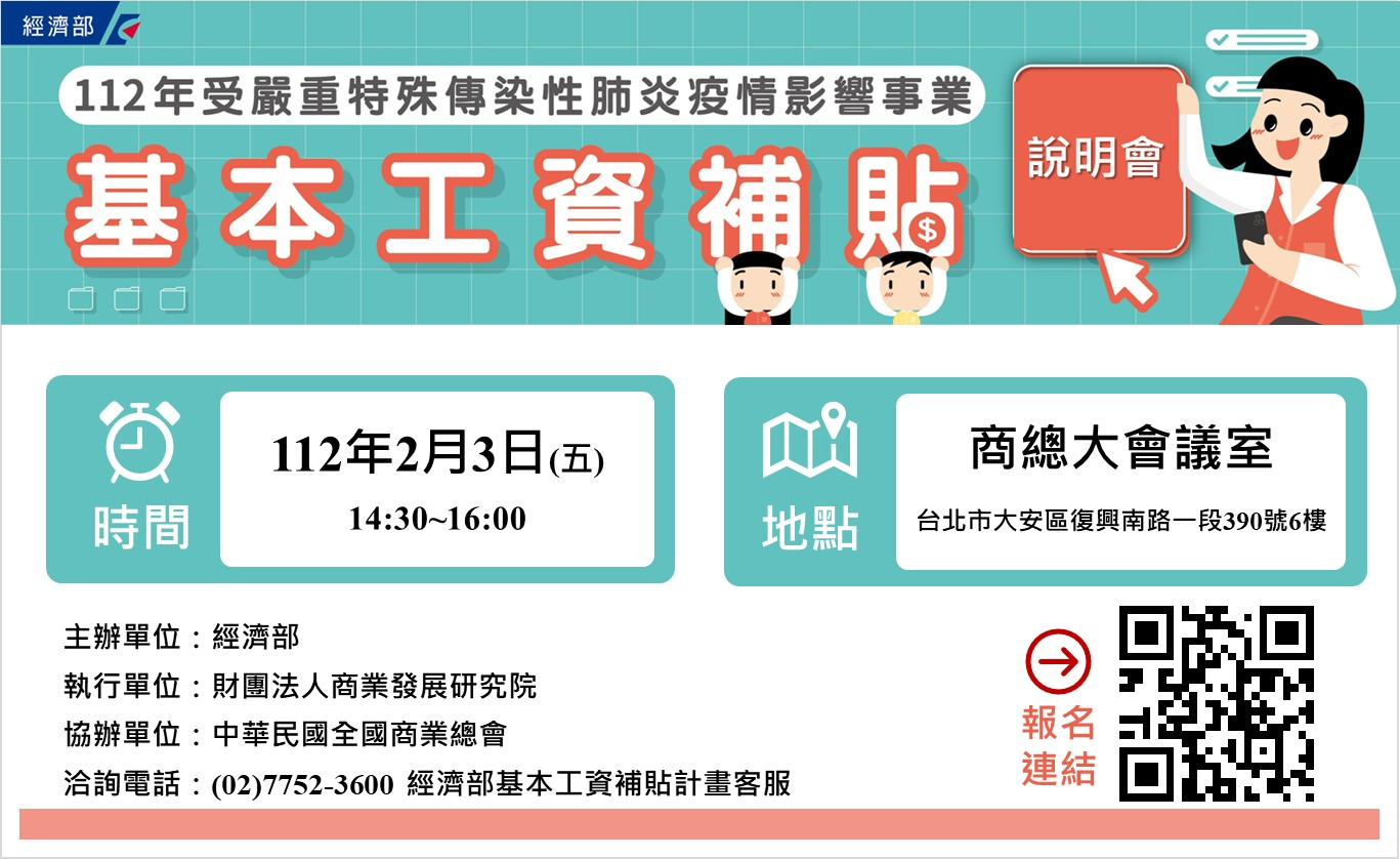 本會協辦「112年受嚴重特殊傳染性肺炎疫情影響事業基本工資補貼說明會」場次,希望透過說明會以簡政便民的補貼方式,以利業者申請,敬請相關產業踴躍報名! ★112年受嚴重特殊傳染性肺炎疫情影響事業基本工資補貼說明會 ★